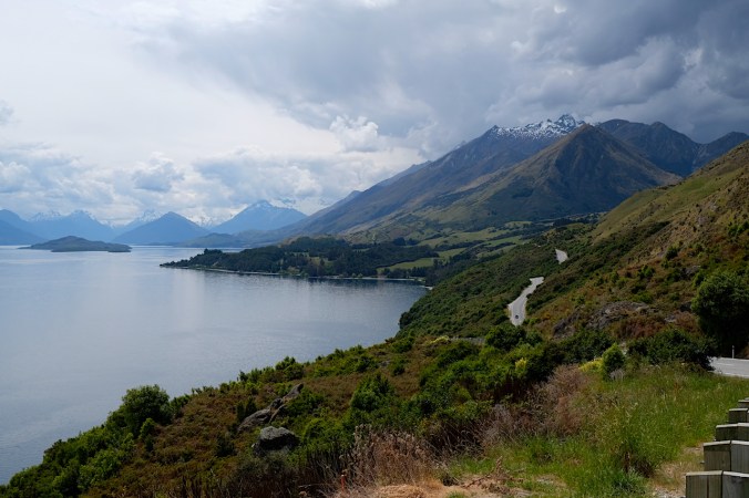 Nur 45 Minuten von Queenstown entfernt, liegt Glenorchy am nördlichen Ufer des Lake Wakatipu. Die Strasse in das etwas abgelegene kleine Dörfchen gehört zu einem der schönsten Streckenabschnitte in ganz Neuseeland. Wir, die lieber unterwegs sind, als in Städten die Zeit totzuschlagen lassen uns dies natürlich nicht zweimal sagen. Die Aussicht ist wahrhaftig wunderschön, die Strasse fast leer, nur das Wetter spielt nicht so ganz mit.