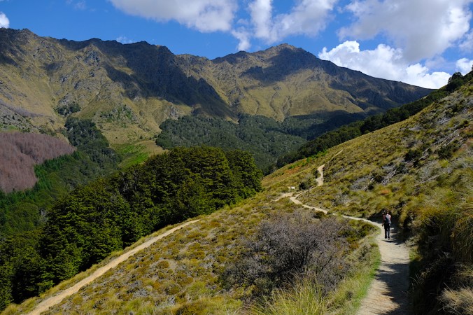 Ich kämpfe mich den Berg hoch. Obwohl die Steigung nur moderat ist, komme ich relativ schnell an mein persönliches Limit. Eine hartnäckige Erkältung plagt mich seit einigen Tagen, die Kräfte scheinen sich irgendwie nicht ganz regeniert zu haben, weshalb ich schliesslich oben am Ben Lomond Saddle angekommen, kapituliere. Die letzten 400 Höhenmeter, über eine steile Steigung, lasse ich Dominique alleine ziehen. Derweil mache ich es mir auf dem Saddle inmitten der Tussock-Gräser bequem, geniesse die Aussicht auf die sich im Hintergrund abzeichnenden schneebedeckten Gipfel und warte. Es könnte durchaus schlimmer sein.