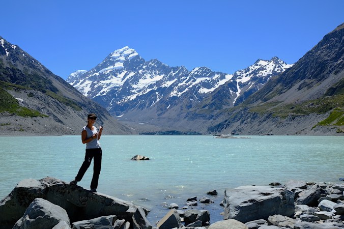 Am Ende des Tracks wartet schliesslich noch ein weiteres Highlight. Vom Gletschersee des Hooker-Gletschers nämlich bietet sich ein besonders schönes Bild auf den Aoraki. Die majestätischen Ausblicke auf Gletscher und die schneebedeckten Berggipfel sind überwältigend. Immer wieder hört man hier ein bedrohliches lautes Grummeln, während riesige Eisflächen abrutschen und ins Tal donnern. Auf dem See schwimmen grosse Eisschollen – wie lange der Gletscher am Fusse des Aoraki tatsächlich noch zu sehen ist, ist wohl nur eine Frage der Zeit. Mal abgesehen von den im See treibenden Eisbergen und der etwas kühlen Temperatur, würde dieser zu einem erfrischenden Bad einladen. Drei hartgesottene junge Frauen neben uns wagen schliesslich gar den Sprung ins kühle Nass. Blöd nur, dass wir die Badesachen im Auto vergessen haben.. 😉