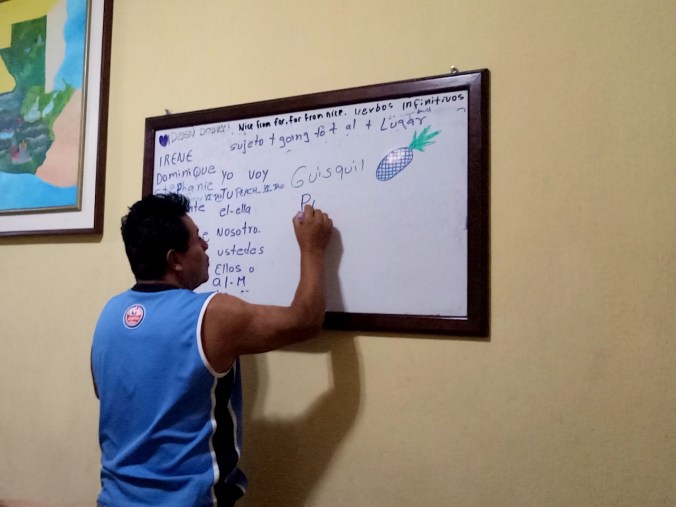 Jeden Abend schliesslich kehren wir pünktlich nach Hause zurück um zusammen mit der ganzen Familie zu Abend zu essen. Mit Ivan, dem einen Sohn der Familie, der noch die hiesige Schule besucht, Rosa und Sebastian plaudern wir über den Tag, über das Erlebte, lachen zusammen und erfreuen uns jeden Tag aufs Neue über die unglaubliche Gastfreundschaft. Dass die Familie tatsächlich Freude daran hat, Studenten ein Zuhause zu bieten, merken wir täglich an der vielen Zeit, welche die gesamte Familie für uns opfert. So plaudern wir nach dem Abendessen fast täglich noch während weiteren zwei Stunden und Sebastian lehrt uns gleichzeitig noch das ein oder andere wichtige, lustige, oder versaute, unnütze Vokabular, über welches wir heute noch schmunzeln müssen. „Mit Sebastian habt ihr einen zweiten Lehrer“, meint Rosa bereits zu Beginn schmunzelnd und auch ein wenig stolz zu uns. Und tatsächlich steht Sebastian mit Stolz und Freude vor seinem Whiteboard um uns bei unserem kleinen Spanischstudium zu unterstützen!