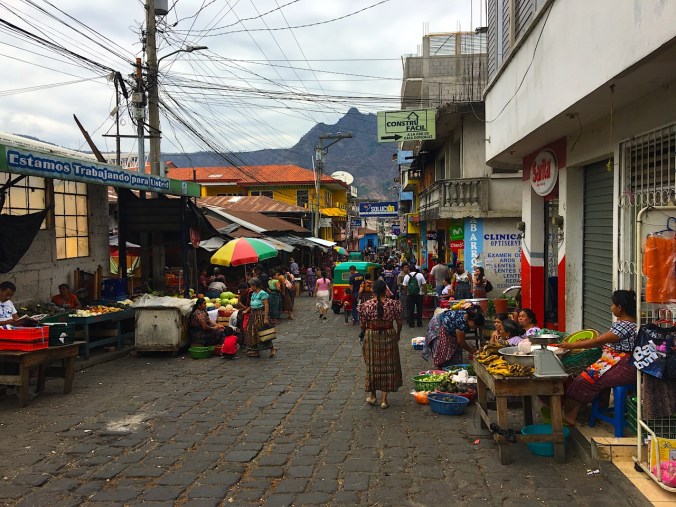 Kaum blicken morgens die ersten Sonnenstrahlen über die Bergkämme klingelt unser Wecker. Bereits um 06:30 Uhr nämlich beginnt unser Tag. Wir machen uns schulfertig, packen unsere sieben Sachen, stärken uns mit einem ausgewogenen Frühstück, bevor wir uns um 7:40 Uhr auf den Weg in die Schule machen. Unser Zuhause liegt etwas nach hinten versetzt nahe des Dorfkerns von San Pedro La Laguna. So marschieren wir täglich durch den Markt, wo bereits frühmorgens ein emsiges Treiben herrscht.
