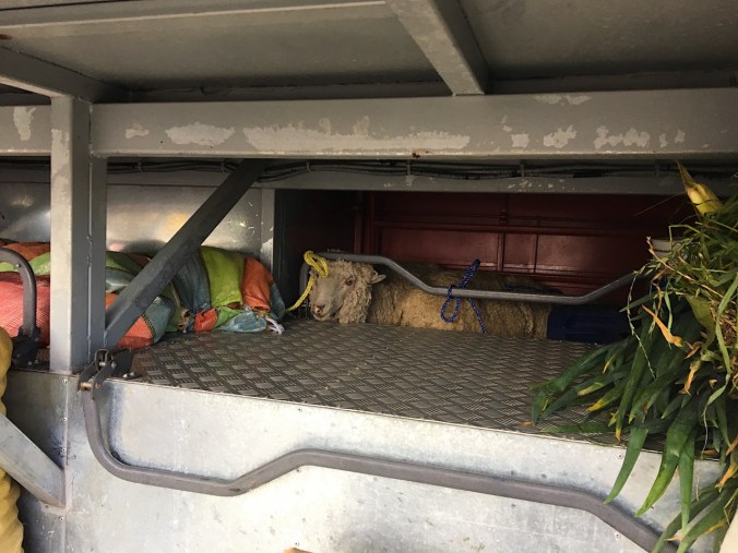 Eingekauftes Schaf im Gepäckraum des Busses